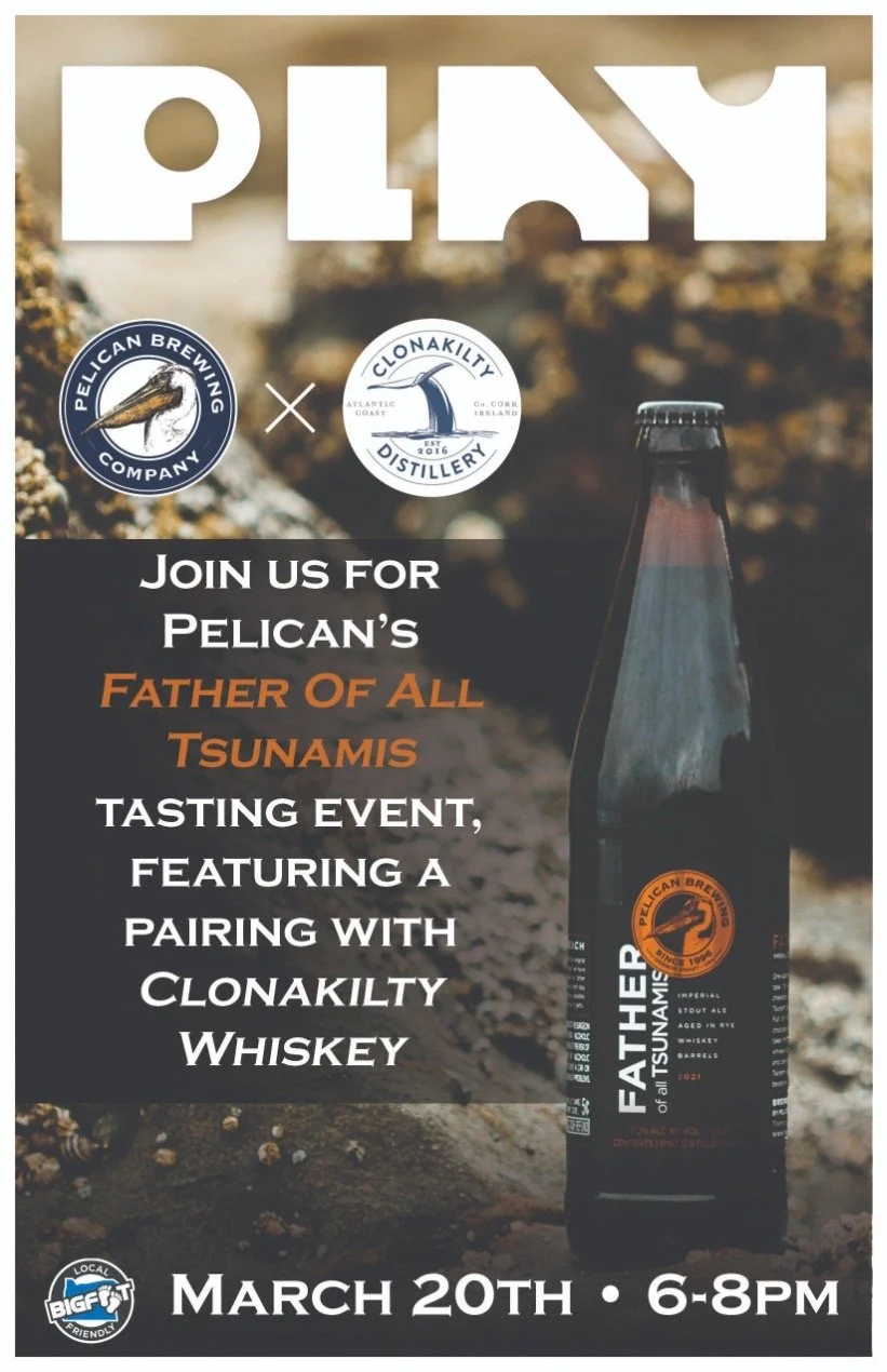 Join us Friday, March 20th for a special event with Pelican Brewing. We are pouring barrel aged Father of all Tsunami's with Clonakilty Irish Whiskey (the actual barrels the beer is aged in)! 6-8pm