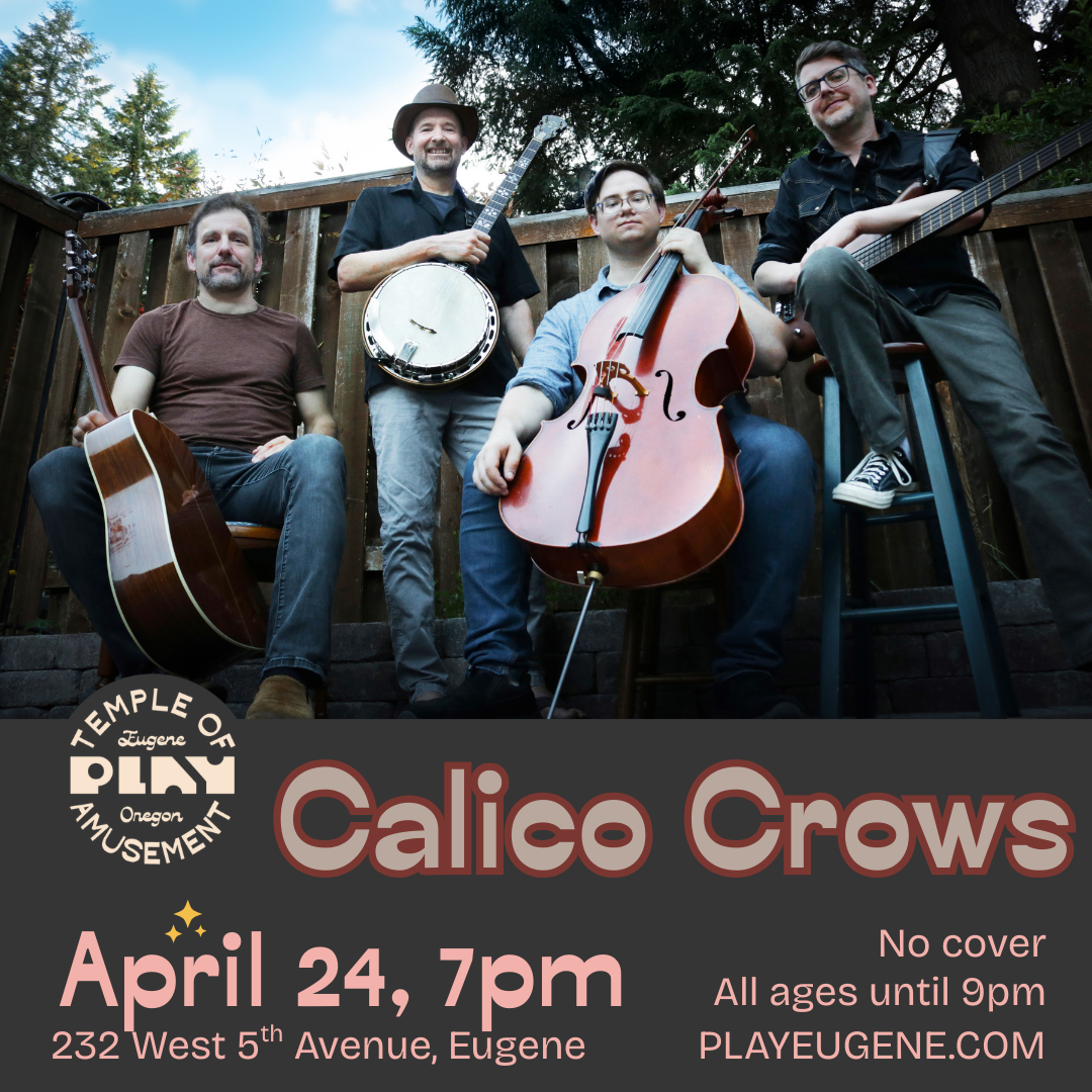 The Calico Crows weave song-driven Americana with roots and indie folk influences, creating sounds that span from delicate balladry to gritty, foot-stomping anthems. Formed in Eugene, Oregon in late 2024, the band features songwriter Brad Nolen (vocals, acoustic guitar, harmonica), Devin Newman (banjo, guitar), Terry Travis (bass), and Titus Young (cello). Their distinctive approach combines traditional American folk instrumentation with modern indie sensibilities, anchored by the percussive, bright attack of banjo paired with the warm, sustained tones of cello—a sonic palette that draws from influences spanning traditional folk, contemporary Americana acts like Wilco and The Jayhawks, and the orchestral indie-folk of bands like The Decemberists and Fleet Foxes. The result is fundamentally song-driven music that bridges the gap between intimate coffeehouse performances and the sweeping arrangements of modern indie folk, creating a sound that feels both authentically rooted and refreshingly innovative.