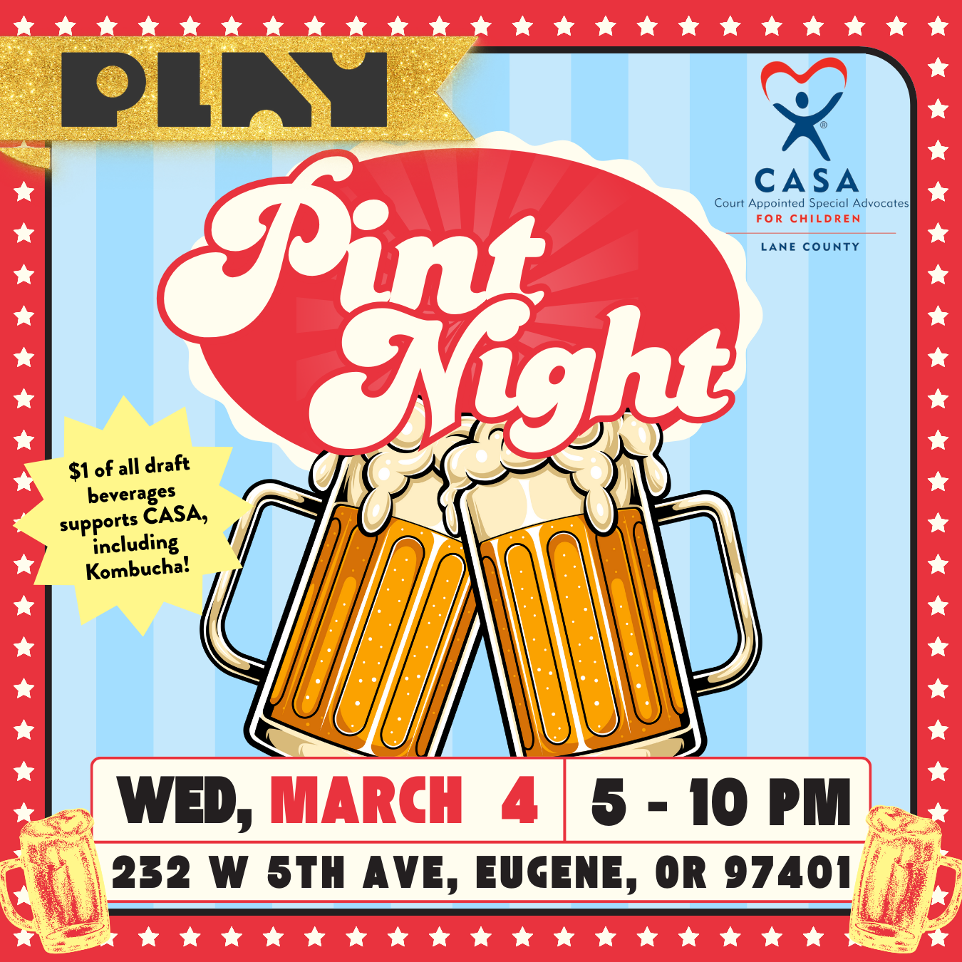 Join us in raising a glass to CASA from 5-10pm. We will donate $1 of every Pint sold to CASA!